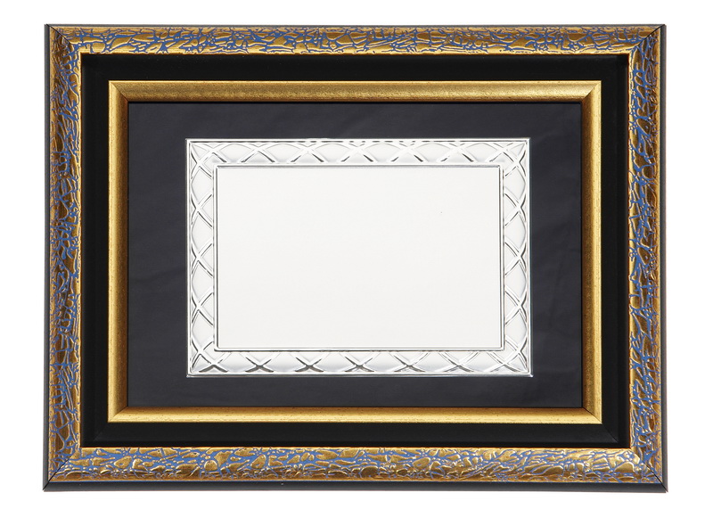 Κορνίζα με σκούρο μπλε φόντο, ξύλινο περίγραμμα και λεπτομέρειες, ειδικά σχεδιασμένη για να φιλοξενεί πλακέτες, αναμνηστικούς δίσκους και στεφάνια, προσφέροντας μία κομψή και επαγγελματική παρουσίαση