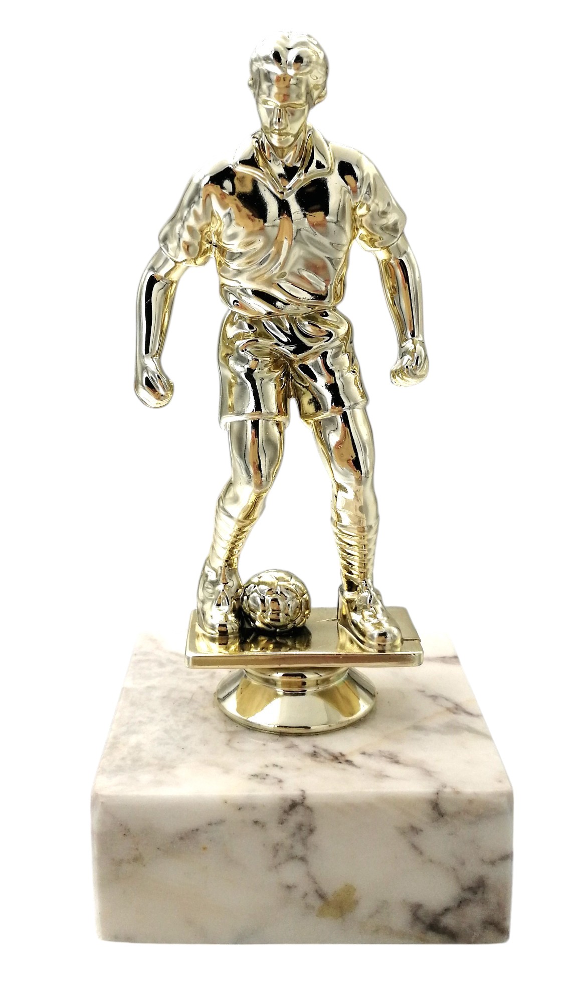 Χρυσό τρόπαιο ποδοσφαίρου με φιγούρα παίκτη, ιδανικό για βραβεύσεις σε ποδοσφαιρικούς αγώνες, τουρνουά και αθλητικές εκδηλώσεις. Κατασκευασμένο από ανθεκτικό υλικό, με μαρμάρινη βάση για σταθερότητα και κομψότητα.