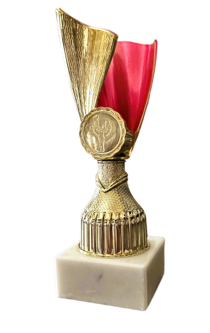 Κύπελλο απονομών χρυσό-ροζ μοντέρνο για αθλητικές και άλλες εκδηλώσεις σε μαρμάρινη βάση.