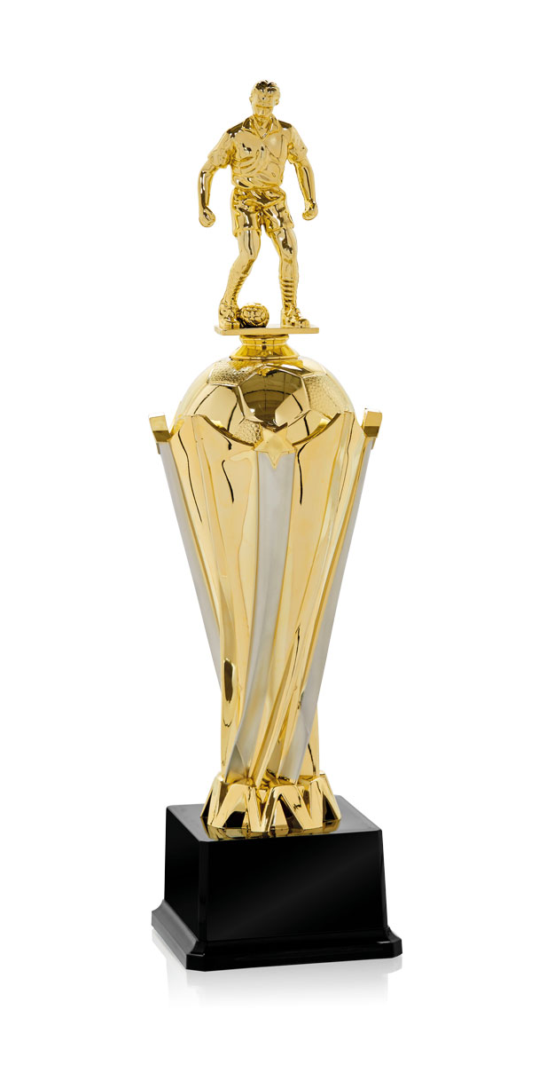 Μοντέρνο έπαθλο βραβεύσεων ποδοσφαίρου σε μεταλλικό χρυσό χρώμα με ποδοσφαιριστή στην κορυφή. Κατασκευασμένο από υψηλής ποιότητας υλικό, τοποθετημένο σε μαύρη βάση για σταθερότητα και κομψότητα.